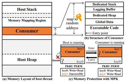 宿主线程的内存布局(a)以及做日志处理的消费者(b)。消费者受MPK的保护(c)