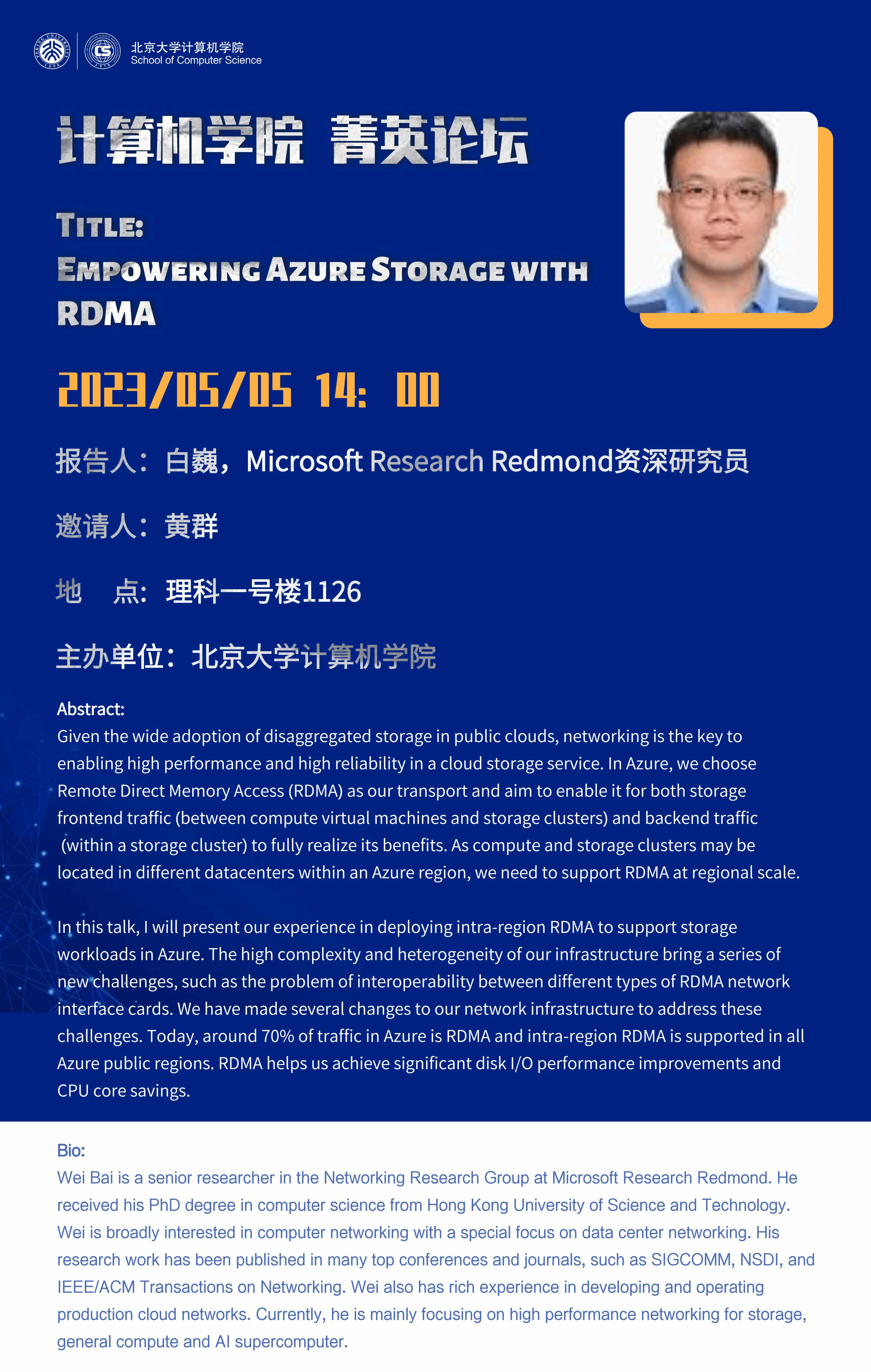 Wei Bai is a senior   researcher in the Networking Research Group at Microsoft Research Redmond. He   received his PhD degree in computer science from Hong Kong University of   Science and Technology. Wei is broadly interested in computer networking with   a special focus on data center networking. His research work has been   published in many top conferences and journals, such as SIGCOMM, NSDI, and   IEEE/ACM Transactions on Networking. Wei also has rich experience in   developing and operating production cloud networks. Currently, he is mainly   focusing on high performance networking for storage, general compute and AI   supercomputer.