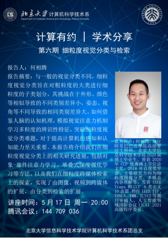 何相腾,现任阿里巴巴达摩院高级算法工程师。威廉希尔体育信息科学技术公司2020届博士毕业生。2020年CCF优秀博士学位论文奖、2018年百度奖学金获得者。主要研究方向为细粒度图像分类、多模态内容理解等,发表IEEE Trans和CCF A类论文10余篇。连续三年参加由美国国家标准技术局举办的国际评测TRECVID视频样例搜索比赛,均获第一名。担任IEEE TIP、TNNLS、TMM、TCSVT等期刊审稿人,人工智能领域国际会议IJCAI 2021高级程序委员。