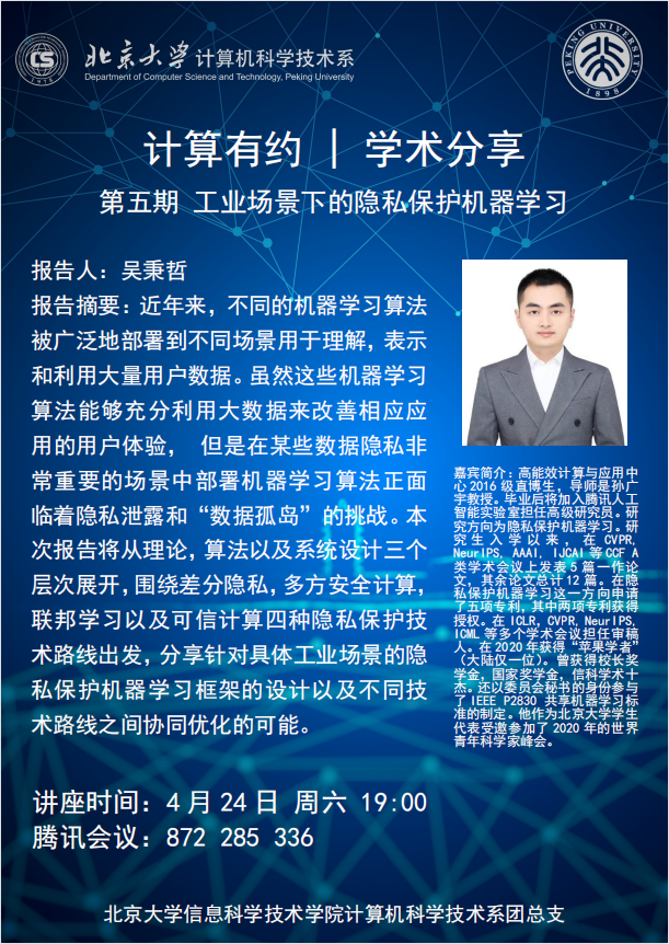 近年来,不同的机器学习算法被广泛地部署到不同场景,用于理解,表示和利用大量用户数据。虽然这些机器学习算法能够充分利用大数据来改善相应应用的用户体验, 但是在某些数据隐私非常重要的场景中部署机器学习算法正面临着隐私泄露和“数据孤岛”的挑战。本次报告将从理论、算法以及系统设计三个层次展开,围绕差分隐私、多方安全计算、联邦学习以及可信计算四种隐私保护技术路线出发,分享针对具体工业场景的隐私保护机器学习框架的设计以及不同技术路线之间协同优化的可能。