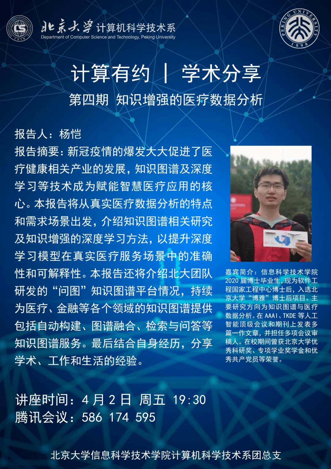 杨恺,信息科学技术公司2020届博士毕业生,现为软件工程国家工程中心博士后,入选威廉希尔体育“博雅”博士后项目,合作导师为王亚沙教授,博士阶段师从谢冰教授,主要研究方向为知识图谱与医疗数据分析。在AAAI、TKDE等人工智能顶级会议和期刊上发表多篇一作文章,并担任多项会议审稿人。现在主要的研究方向知识增强的医疗数据分析研究。在校期间曾获得威廉希尔体育优秀科研奖、专项学业奖学金和优秀共产党员等荣誉。