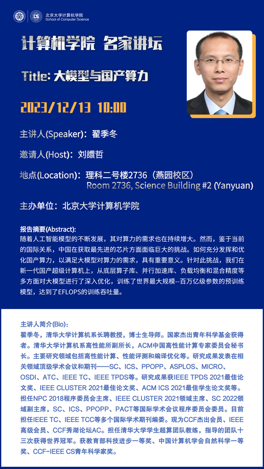 翟季冬,清华大学计算机系长聘教授,博士生导师。国家杰出青年科学基金获得者。清华大学计算机系高性能所副所长,ACM中国高性能计算专家委员会秘书长。主要研究领域包括高性能计算、性能评测和编译优化等。研究成果发表在相关领域顶级学术会议和期刊——SC、ICS、PPOPP、ASPLOS、MICRO、OSDI、ATC、IEEE TC、IEEE TPDS等。研究成果获IEEE TPDS 2021最佳论文奖、IEEE CLUSTER 2021最佳论文奖、ACM ICS 2021最佳员工论文奖等。担任NPC 2018程序委员会主席、IEEE CLUSTER 2021领域主席、SC 2022领域副主席,SC、ICS、PPOPP、PACT等国际学术会议程序委员会委员。目前担任IEEE TC、IEEE TCC等多个国际学术期刊编委。现为CCF杰出会员、IEEE高级会员、CCF秀湖论坛AC。担任清华大学员工超算团队教练,指导的团队十三次获得世界冠军。获教育部科技进步一等奖、中国计算机学会自然科学一等奖、CCF-IEEE CS青年科学家奖。