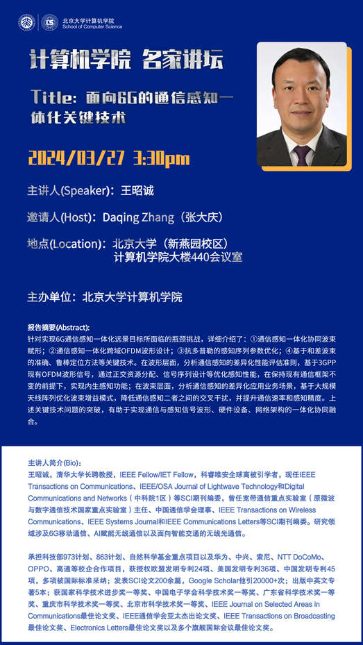 王昭诚,清华大学长聘教授,IEEE Fellow/IET Fellow,科睿唯安全球高被引学者,现任IEEE Transactions on Communications、IEEE/OSA Journal of Lightwave Technology和Digital Communications and Networks(中科院1区)等SCI期刊编委,曾任宽带通信重点实验室(原微波与数字通信技术国家重点实验室)主任、中国通信学会理事、IEEE Transactions on Wireless Communications、IEEE Systems Journal和IEEE Communications Letters等SCI期刊编委。研究领域涉及6G移动通信、AI赋能无线通信以及面向智能交通的无线光通信。