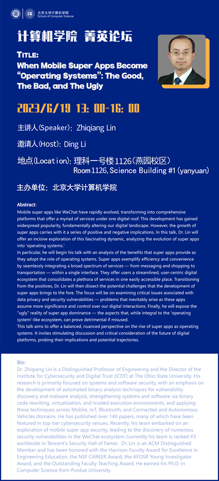 Dr. Zhiqiang Lin is a Distinguished Professor of Engineering and the Director of the Institute for Cybersecurity and Digital Trust (ICDT) at The Ohio State University. His research is primarily focused on systems and software security, with an emphasis on the development of automated binary analysis techniques for vulnerability discovery and malware analysis, strengthening systems and software via binary code rewriting, virtualization, and trusted execution environments, and  applying these techniques across Mobile, IoT, Bluetooth, and Connected and Autonomous Vehicles domains. He has published over 140 papers, many of which have been featured in top-tier cybersecurity venues. Recently, his team embarked on an exploration of mobile super app security, leading to the discovery of numerous security vulnerabilities in the WeChat ecosystem (currently his team is ranked #3 worldwide in Tencent's Security Hall of Fame).  Dr. Lin is an ACM Distinguished Member and has been honored with the Harrison Faculty Award for Excellence in Engineering Education, the NSF CAREER Award, the AFOSR Young Investigator Award, and the Outstanding Faculty Teaching Award. He earned his Ph.D. in Computer Science from Purdue University.