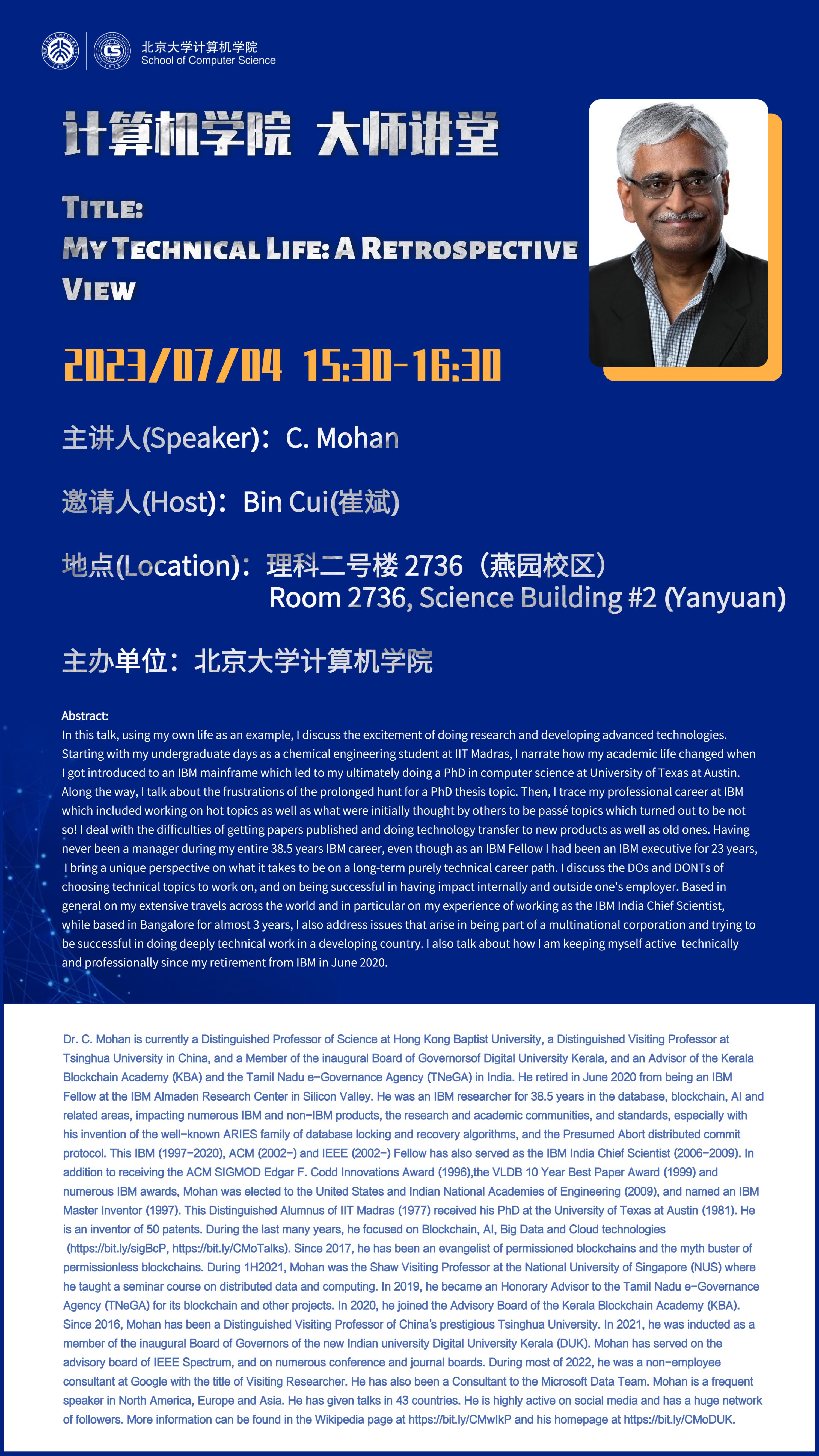 Dr. C. Mohan is currently a Distinguished Professor of Science at Hong Kong Baptist University, a Distinguished Visiting Professor at Tsinghua University in China, and a Member of the inaugural Board of Governors of Digital University Kerala, and an Advisor of the Kerala Blockchain Academy (KBA) and the Tamil Nadu e-Governance Agency (TNeGA) in India. He retired in June 2020 from being an IBM Fellow at the IBM Almaden Research Center in Silicon Valley. He was an IBM researcher for 38.5 years in the database, blockchain, AI and related areas, impacting numerous IBM and non-IBM products, the research and academic communities, and standards, especially with his invention of the well-known ARIES family of database locking and recovery algorithms, and the Presumed Abort distributed commit protocol. This IBM (1997-2020), ACM (2002-) and IEEE (2002-) Fellow has also served as the IBM India Chief Scientist (2006-2009). In addition to receiving the ACM SIGMOD Edgar F. Codd Innovations Award (1996), the VLDB 10 Year Best Paper Award (1999) and numerous IBM awards, Mohan was elected to the United States and Indian National Academies of Engineering (2009), and named an IBM Master Inventor (1997). This Distinguished Alumnus of IIT Madras (1977) received his PhD at the University of Texas at Austin (1981). He is an inventor of 50 patents. During the last many years, he focused on Blockchain, AI, Big Data and Cloud technologies (https://bit.ly/sigBcP, https://bit.ly/CMoTalks). Since 2017, he has been an evangelist of permissioned blockchains and the myth buster of permissionless blockchains. During 1H2021, Mohan was the Shaw Visiting Professor at the National University of Singapore (NUS) where he taught a seminar course on distributed data and computing. In 2019, he became an Honorary Advisor to the Tamil Nadu e-Governance Agency (TNeGA) for its blockchain and other projects. In 2020, he joined the Advisory Board of the Kerala Blockchain Academy (KBA). Since 2016, Mohan has been a Distinguished Visiting Professor of China’s prestigious Tsinghua University. In 2021, he was inducted as a member of the inaugural Board of Governors of the new Indian University Digital University Kerala (DUK). Mohan has served on the advisory board of IEEE Spectrum, and on numerous conference and journal boards. During most of 2022, he was a non-employee consultant at Google with the title of Visiting Researcher. He has also been a Consultant to the Microsoft Data Team. Mohan is a frequent speaker in North America, Europe and Asia. He has given talks in 43 countries. He is highly active on social media and has a huge network of followers. More information can be found in the Wikipedia page at https://bit.ly/CMwIkP and his homepage at https://bit.ly/CMoDUK.