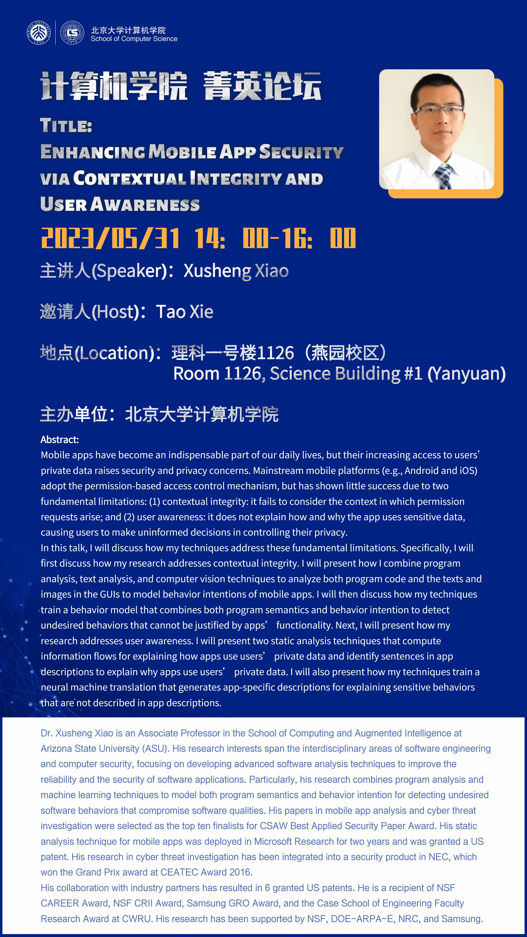 Dr. Xusheng Xiao is an Associate Professor in the School of Computing and Augmented Intelligence at Arizona State University (ASU). His research interests span the interdisciplinary areas of software engineering and computer security, focusing on developing advanced software analysis techniques to improve the reliability and the security of software applications. Particularly, his research combines program analysis and machine learning techniques to model both program semantics and behavior intention for detecting undesired software behaviors that compromise software qualities. His papers in mobile app analysis and cyber threat investigation were selected as the top ten finalists for CSAW Best Applied Security Paper Award. His static analysis technique for mobile apps was deployed in Microsoft Research for two years and was granted a US patent. His research in cyber threat investigation has been integrated into a security product in NEC, which won the Grand Prix award at CEATEC Award 2016.
