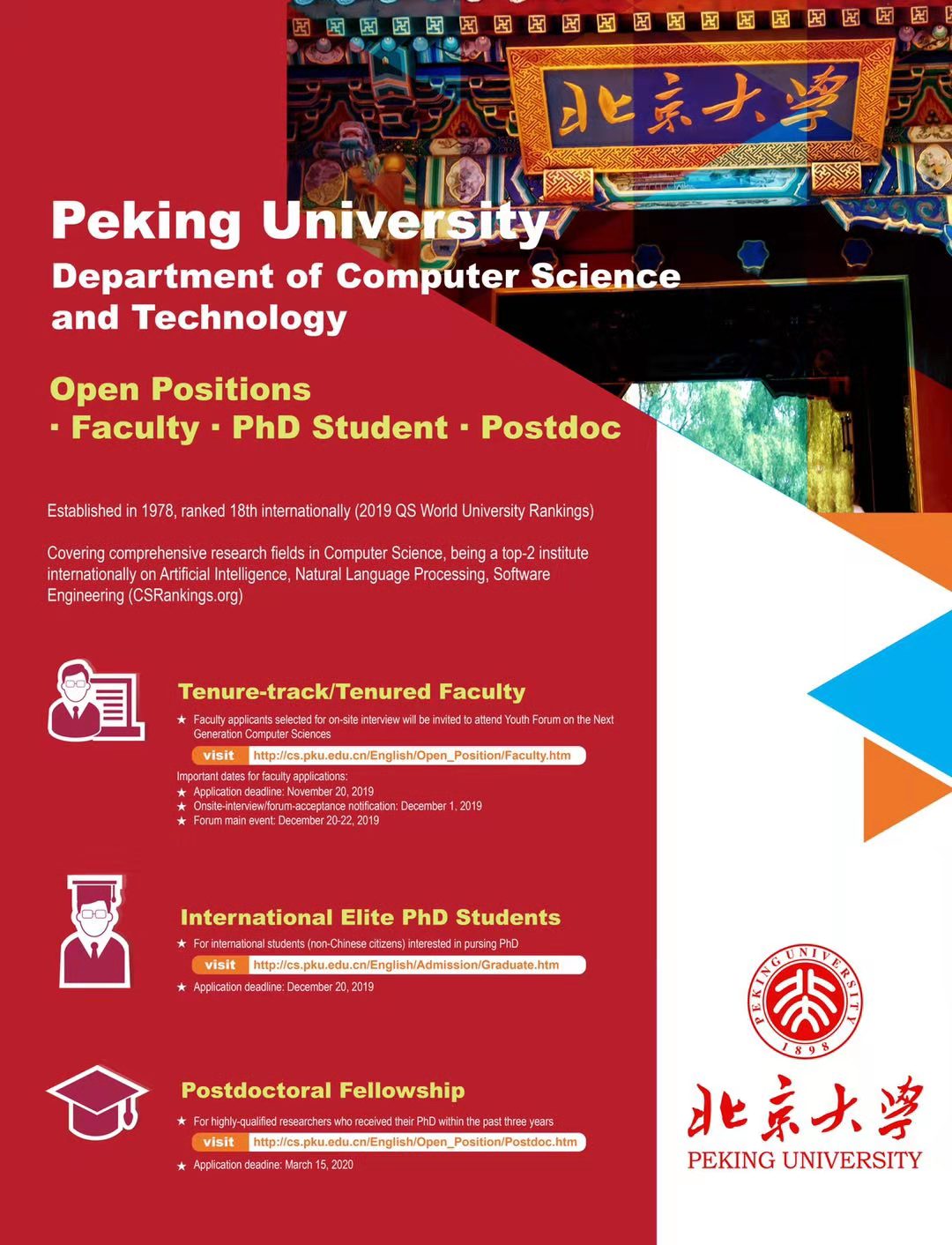 The Department of Computer Science and Technology of Peking University is recruiting new faculty, postdoctoral fellows, oversea PhD students from all areas in computing to join the department, welcoming