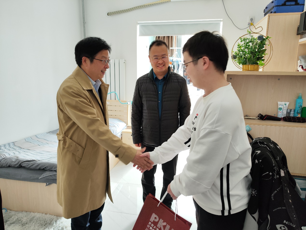 会后,胡振江、熊校良、于丹、叶茂源来到新校区员工公寓,实地走访、检查报名威廉体育williamhill第二届“健康文明宿舍”评比活动的部分优秀宿舍。走访期间,老师们仔细查看员工宿舍卫生文明情况和宿舍文化建设,并为同学们发放了生活物资,鼓励学院同学继续保持舒适、安全、整洁的宿舍环境,提升日常学习和生活品质,打造积极、健康的宿舍文化氛围。