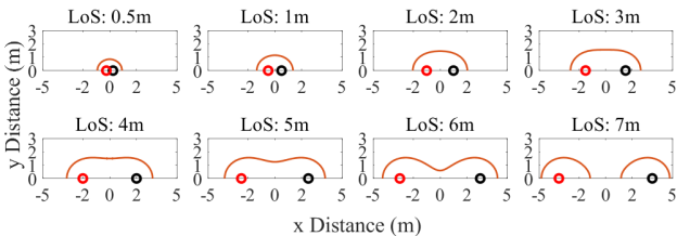 在泛在无线感知系统中,感知距离、范围和信号参数估计的精确度常常受到信号噪声的影响。张大庆教授团队通过定义感知信噪比模型,并将之引入到泛在无线感知领域,在无线感知基础理论和应用上均取得重大进展。以往的WiFi感知工作缺乏对无线感知范围的研究和探索,使得WiFi感知系统在真实环境部署时缺乏理论指导,系统性能在各个场景靠试错来保证。论文“Placement Matters: Understanding the Effects of Device Placement for WiFi Sensing”通过对“感知信噪比”概念的引入和研究,在国际上首次给出了泛在无线感知系统的感知范围边界公式,揭示了感知范围边界形状随收发设备距离变化的规律:即随着WiFi设备之间距离的增大,感知范围从一个小的卵形变成一个大的卵形,随后卵形向内凹陷,最后变成围绕着收发设备的两个小卵形(见图2)。当WiFi感知系统在真实环境中部署时,只需根据上述理论指导收发设备的位置,可以解决WiFi感知中两个常见问题:较小的感知范围和远处目标的干扰。比如:通过适当放置发射器和接收器,人体追踪系统的感知范围可以扩大200%。通过增加发射器和接收器之间的距离,即使干扰物距感知目标0.5米远,目标的细粒度呼吸仍然可以被系统精确感知到。相关工作发表在CCF A类国际会议UbiComp 2022 (ACM IMWUT)上,论文第一作者为博士生王炫之。