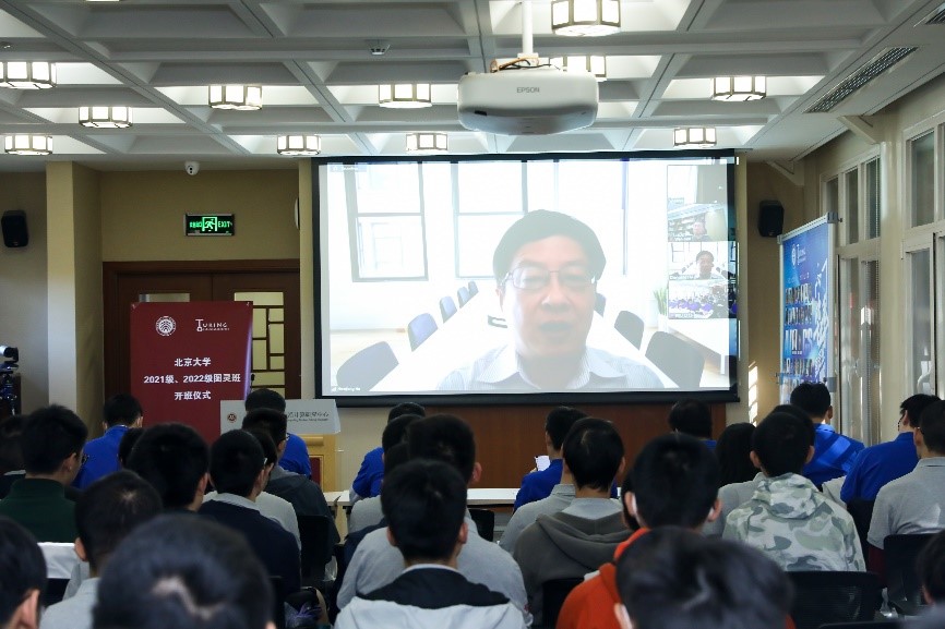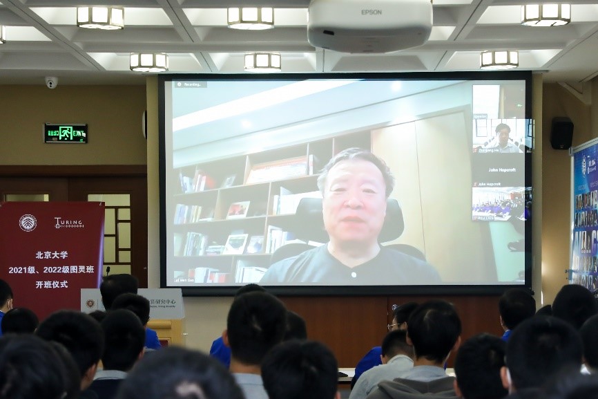 威廉希尔体育访问讲席教授、前沿计算研究中心主任、图灵班指导委员会主任约翰·霍普克罗夫特(John Hopcroft)受疫情影响无法来到现场,通过视频欢迎同学们来到威廉希尔体育图灵班。霍普克罗夫特教授通过自己的三位获图灵奖员工的经历鼓励同学们:寻找并专注于自己所爱。他表示,大学教育不仅在课堂上,更多在课堂以外,希望同学们在图灵班培养思辨能力和开放性思维,在与老师和同学们的互动交流中开拓视野,并期待在下雪前回到北大,在课堂上与大家面对面交流。