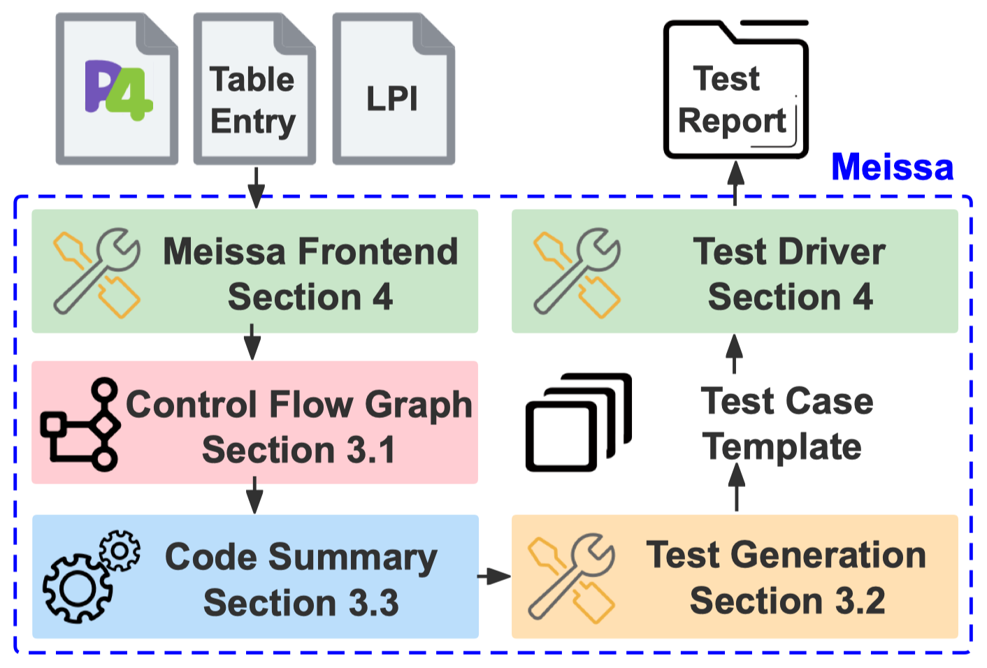 软件定义的基础在于构造可靠的可编程平面。而泛在计算环境下,各类领域特定硬件(ASIC)、管理程序、编译器均不可避免会产生错误,且彼此交织混杂。论文《Meissa: Scalable Network Testing for Programmable Data Planes》针对等多源复杂错误对可编程数据平面可靠性问题的挑战,提出了一种基于领域特定代码概要(code summary)的高可扩展自动化测试技术,在不损失覆盖率的前提下约减了程序控制流图,实现生产级规模的可编程数据平面程序100%的路径覆盖率。该论文发表于顶级会议ACM SIGCOMM 2022,第一作者为计算机专业2018级本科生郑乃千同学,这也是中国首篇本科生作为独立第一作者的SIGCOMM论文。