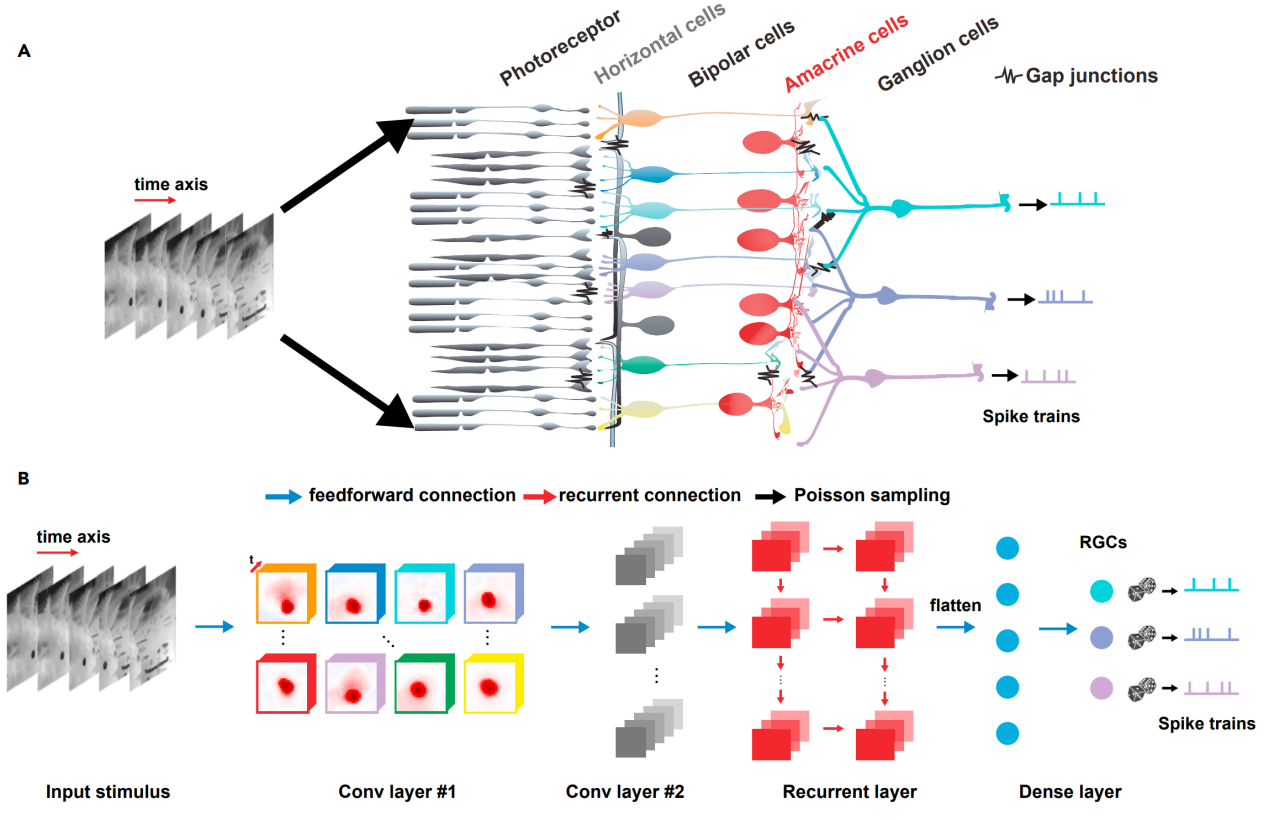 为了突破上述瓶颈,威廉希尔体育信息科学技术公司计算机系、数字视频编解码技术国家工程实验室黄铁军教授课题组提出并实现了一种基于卷积循环神经网络的视网膜编码模型,能够高精度地预测大规模视网膜神经节细胞对动态自然场景的响应,同时可以学习出各个神经节细胞的感受野。所提出的卷积循环编码网络除了在结构上更加接近视网膜,还可以使用更少的参数学习出精度更高的编码模型。实验结果揭示了网络的循环连接结构是影响视网膜编码的关键因素。这一模型不仅具有生物学价值,而且对设计新一代脉冲视觉模型、芯片乃至研制视网膜假体都具有重要意义。