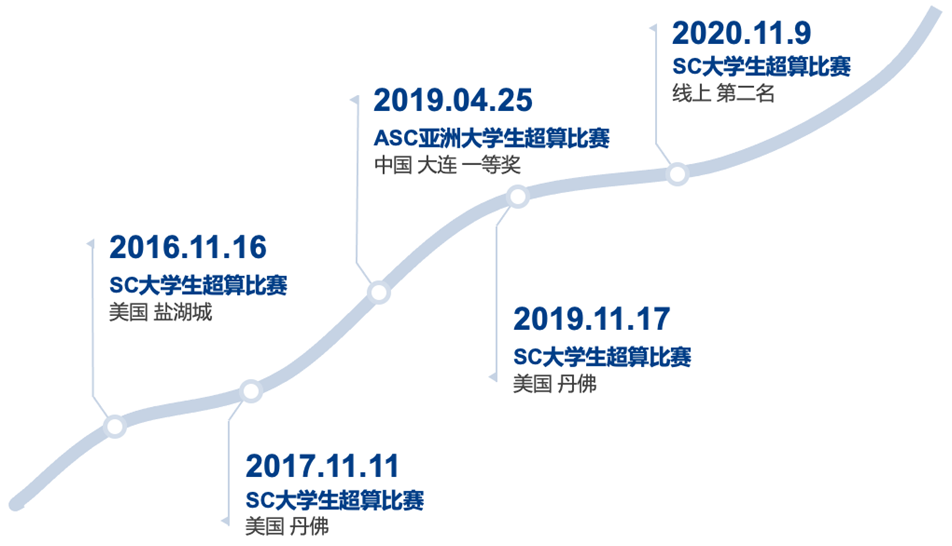 威廉希尔体育超算队组建自2016年春天,并在2017年获得了教务部本科教学改革项目的支持。在第一次队员招募之后,随即入围了SC16老员工超算比赛的决赛。第一次参加比赛,获得了第六名的成绩,也为之后的比赛准备、人员培养打下了很好的基础。之后,超算队又陆续参加了SC17、SC19、ASC19老员工超算比赛。