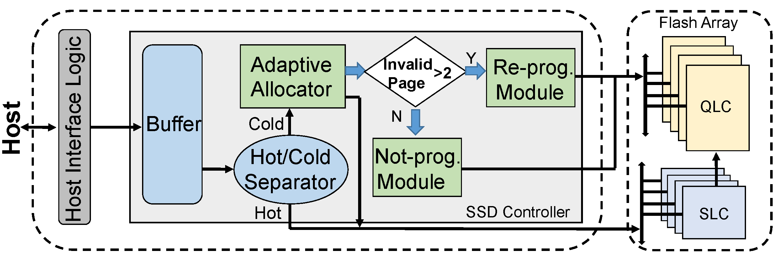 计算机存储系统对密度与容量的需求持续增加,三星、美光等国外公司和国内长江存储近两年相继推出200层3D堆叠闪存芯片,并采用4比特每存储元的QLC技术。由于制程工艺的限制,3D QLC在可靠性与性能等方面面临着巨大挑战,故而其采用一种全新的编程方式,即基于WL粒度(4个物理页同时编程)的两步编程方式。厦门大学李乔老师团队在今年HotStorage论文中首次指出3D QLC的两步编程方式中,存在对无效数据页的编程,将其定义为无效编程问题(invalid programming)。针对该问题,本文首次提出系统的解决方案,利用无效页的存在实现有效页的高效编程,在不改变闪存芯片硬件的前提下,最小化对无效编程产生的能耗和性能损耗,并提升有效页的可靠性。论文提出了三个无效数据辅助策略来提升有效数据写入性能和可靠性。论文首先提出了一种对有效数据进行重新组织编程(Re-prog)的方案,避免对无效数据的精细编程操作,缩短编程的时间,提升了写入性能。其次,论文提出了非编程(Not-prog)方案,利用Wordline中存在的无效页,改变精细编程步骤中的数据,提升了其他有效页的可靠性。最后,论文基于最新的混合Flash,设计出了SLC和QLC区域之间的动态数据管理和自适应数据分配策略,减少了无效编程的发生。基于真实芯片和模拟器的评估表明,所提出的策略对3D QLC可靠性、性能和能耗均有较大的提升。