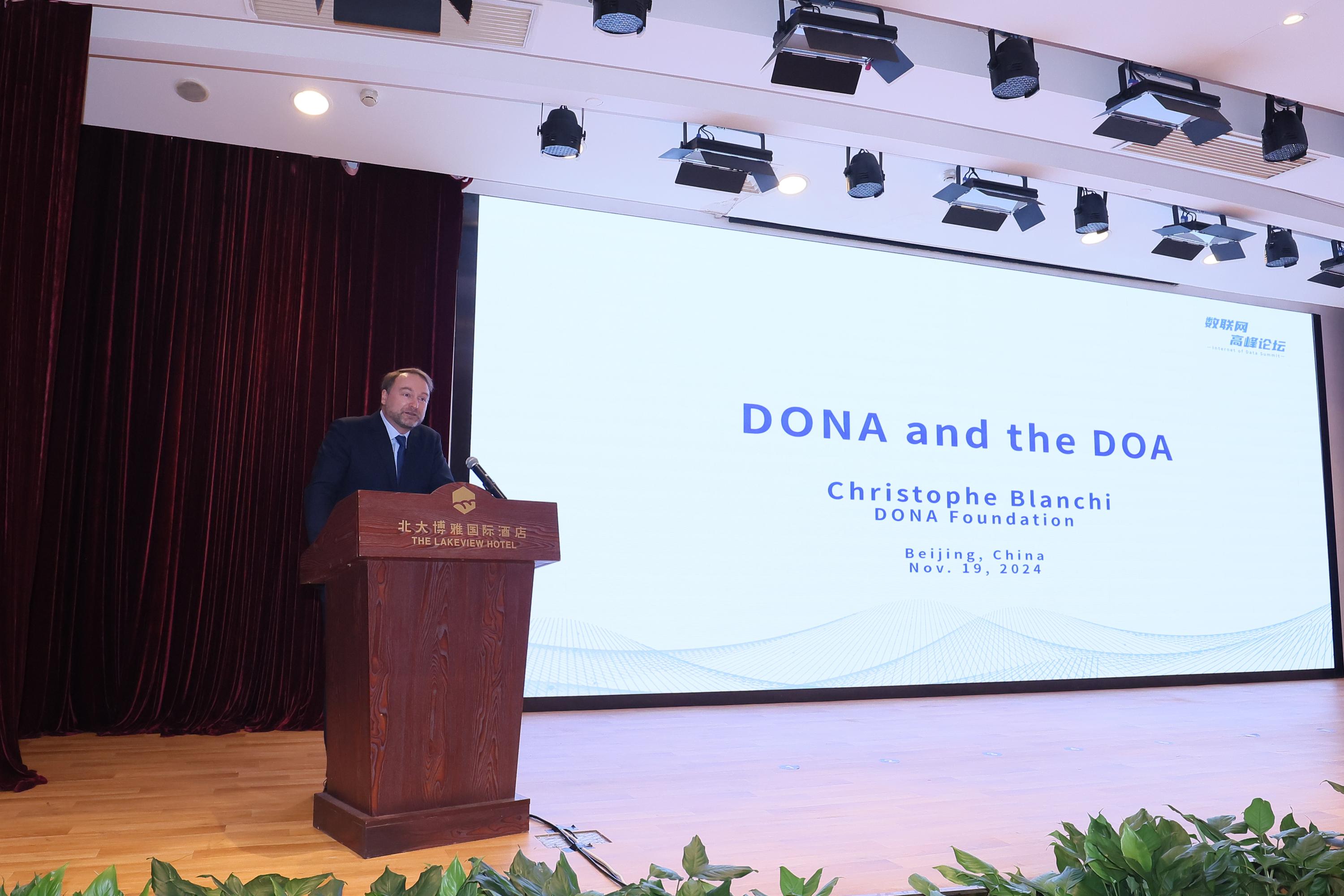 克里斯托夫·布兰奇(Christophe Blanchi)介绍了DONA的发展历程、治理体系和应用实践。DONA理事镇锡惠介绍了平等自主开放、全球协调共管的DONA组织架构和全球DOA根节点运营服务机制。ATSD执委会主席孙洵(Sam Sun)介绍了DOA应用的技术开发和标准促进工作,并呼吁各方共同推动DOA和数联网的相关标准研发,支撑全球数据基础设施的建设和运营。