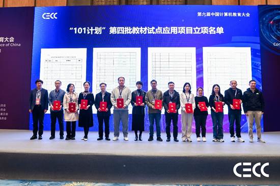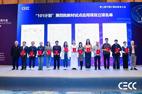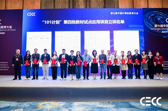 大会期间还举行了“101计划”第四批教材试点立项证书颁发仪式,教材试点单位代表上台领取立项证书。第四批教材试点应用工作共批准112个试点项目,立项项目将在2025年春季学期开展试点教学工作。