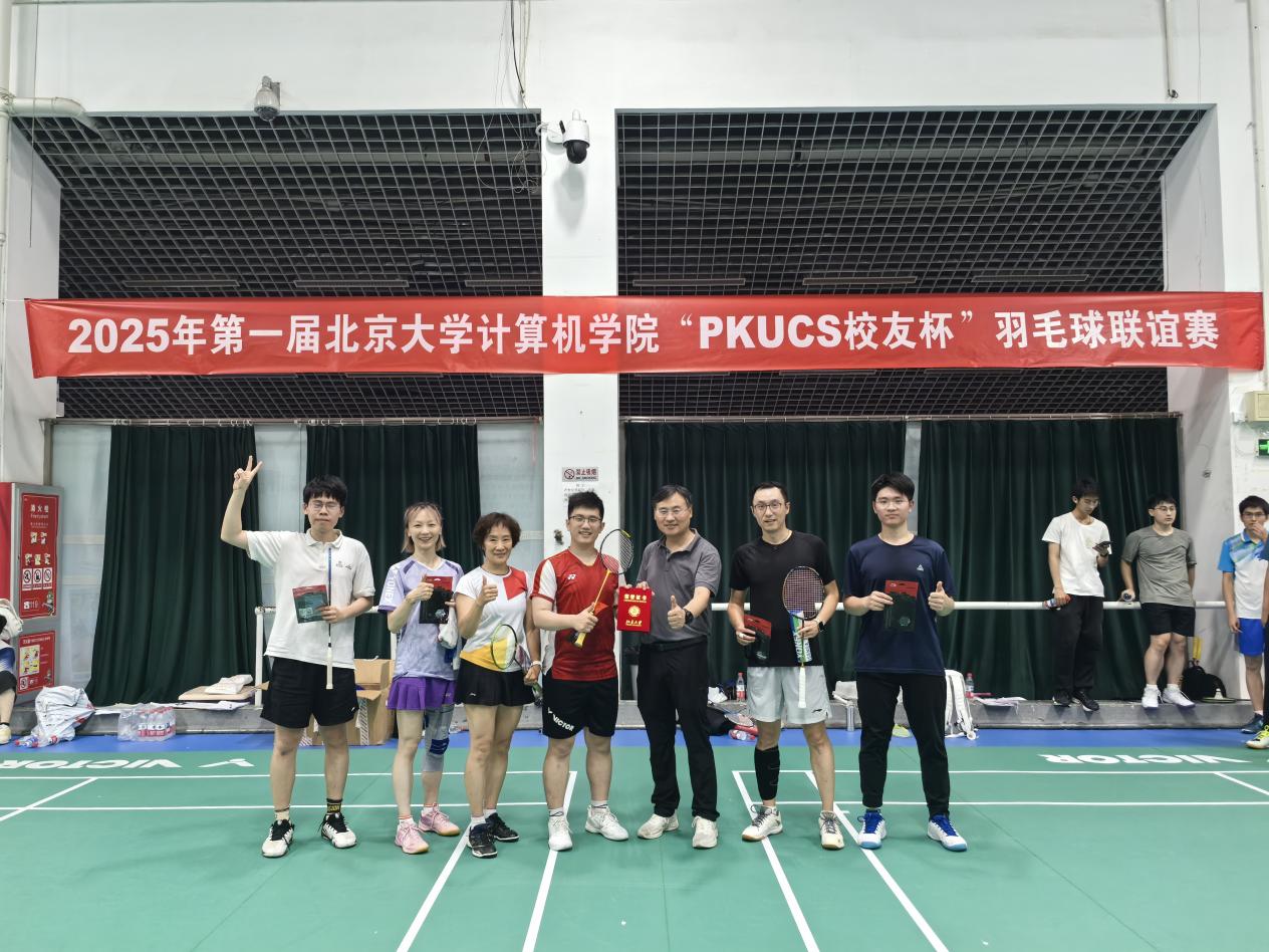 散人所队:首届pkucs员工杯羽毛球联赛,在易老师的号召下,我们成立了全新的羽球机构“散人所”。虽然赛前我们大多素未谋面,但我们很快达成了“快乐羽球,增进情谊”的默契。在赛场上,我们秉持“绝不偷后场”的原则,打出了独属于我们“散人所”友好而飘逸的球风:C位担当的鹏霄学弟能用反手杀绝不使用正手;福恋学姐屡次上演教科书般的网前抹扑;易学姐身手矫健中前场各种横飞拦截;符璨员工左挡右分球场老登;而刚毕业的皓晨与楚才学弟,也打得相当放松老练,各种假放真推死亡平高,耐心地在多拍中取得胜利。在四场精彩纷呈的比赛中,我们相互鼓励,挥汗如雨,与王选所上演了一混的巅峰对决,也在“不加班队”下班前给他们的男双上了一场强度。唯一的遗憾是15分制赛程略短,四点半比赛左右结束后大家还意犹未尽,皓晨和楚才学弟继续与相识员工相约开单,再续情谊。