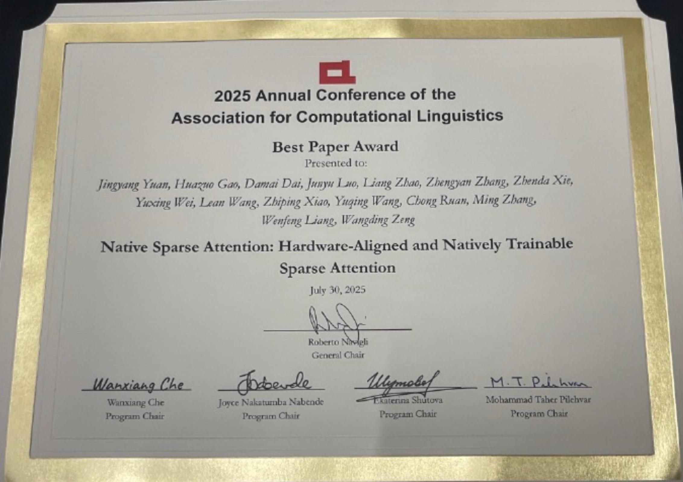 最佳论文:Native Sparse Attention: Hardware-Aligned and Natively Trainable Sparse Attention