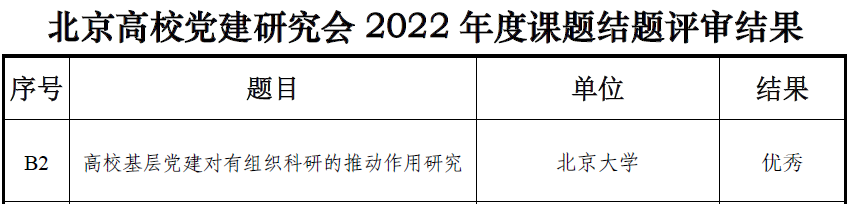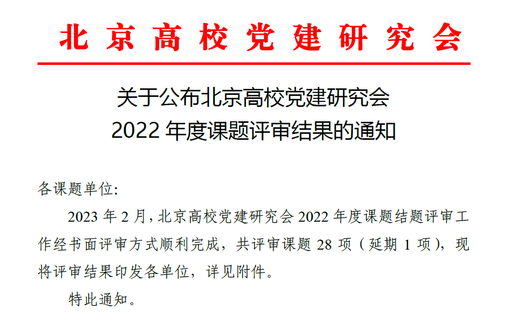 北京高公司党建研究会近日发布了《关于公布北京高公司党建研究会2022年度课题评审结果的通知》。公司党委立项的高公司党建研究重点课题——《高校基层党建对有组织科研的推动作用研究》,顺利通过评审,并被评为“优秀”课题。此次参加评审的课题共28项,评为优秀的有7项。