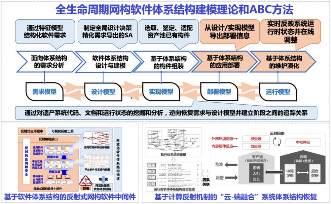 梅宏和黄罡带领团队,经过十多年研究与实践,揭示了网构软件系统高层结构之多阶段复杂性关联,提出全生命周期软件体系结构(Software Architecture,SA)概念及其建模理论和 ABC (Architecture Based component Composition)方法,将软件生命期各阶段的核心制品与活动统一为SA模型及其迭代细化和转换,大幅提高软件开发和演化效率及质量;揭示了网构软件系统运行时体系结构机理与性质,提出运行时软件体系结构(Runtime Software Architecture, RSA)概念,将SA从开发阶段拓展到运行阶段,建立了基于模型双向变换和代码自动生成的网构软件RSA构造与演化方法;揭示了系统设计、实现与运行间的逆向追踪性质,提出基于程序、文档和运行数据分析的SA模型恢复方法,发明了客户端驱动的SA资源反射方法与机制,支持逆向理解和重构系统RSA并实时监测与控制;发明了人机协同的互操作接口自动化生成方法,代码生成率超95%;实现了多种常见信息孤岛业务数据和功能互操作接口的自动化生成和运行服务,信息孤岛开放效率平均提升两个数量级,颠覆了传统互操作技术的“白盒”途径。研制的系统平台和工具在国家大数据战略若干重大工程和任务中得到广泛应用,相关技术进入数字对象架构标准。作为中国学者提出的学术概念,网构软件已经成为互联网计算研究的重要内容,在国际学术界形成显著影响。