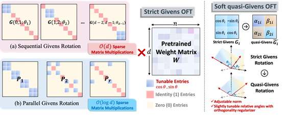 随着预训练语言模型(PLMs)性能的日益增长和规模的爆炸性扩张,参数高效微调(Parameter-Efficient Fine-Tuning,PEFT)已成为有效适配各种下游任务与垂直领域的关键需求。一种代表性的微调方法是正交微调(OFT),相比于其他微调方法如LoRA等,它能够严格保留参数空间内的角度量以保持预训练语义特征关联,从而保留预训练知识与概念,避免灾难性遗忘的问题。虽然如此,OFT仍然面临两方面的挑战:一是其参数复杂度高(