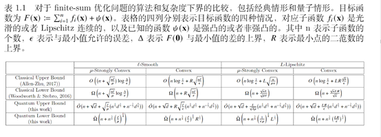 n个损失函数f_i(x) 的平均值的优化问题在大规模机器学习中具有广泛的应用,包括支持向量机和逻辑回归等。近年已有对于该问题的经典算法和经典查询复杂度下界的相关研究,但量子算法对该优化问题可能存在的加速或者限制仍亟待探索。论文《Quantum Algorithms and Lower Bounds for Finite-Sum Optimization》考虑子函数是光滑凸函数以及一个已知的强凸函数 \psi(x) 的情形,首次设计出具有显著的加速效果的量子算法,同时证明了关于n和条件数非平凡的量子复杂度下界。该论文的量子算法和复杂度下界均可扩展到 \psi(x) 非强凸或者子函数仅Lipschitz连续的情形。量子与经典的比较如图所示。