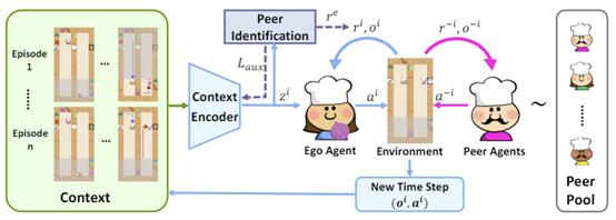 快速适应策略多样且未知的同伴(无论是队友还是对手)是多智能体领域的一个关键挑战。为了实现这个目标,智能体需要高效探测和识别同伴的策略,这样才能随后确定并执行最优回应策略。然而,探索未知同伴的策略可能是非常困难的,尤其是在部分可观测的长程场景中,同伴可能只会在特定的环境状态下展现出自己的策略特点,且从得知同伴策略到习得最优回应之间的反馈链条很长,从而带来了学习上的挑战。尽管近期的对手建模相关工作提供了一些对同伴进行建模的方法,但这些方法普遍忽略了探索问题,可能导致建模的失败。针对这些问题,论文提出了一个同伴识别奖励机制,可以鼓励智能体进行探索,获得有意义的上下文信息,对同伴的策略进行识别。与原任务的奖励函数结合后,最终得到的基于上下文的策略可以基于时间限制来平衡探索与利用,在不清楚同伴策略的时候进行探索、获取信息,并在较为确定的时候执行最优回应策略。在涵盖合作、对抗和混合等多种场景的环境中,论文提出的方法都展现出了显著的效果,使智能体习得了主动探索同伴的行为,并以此为基础实现了更好的同伴适应。