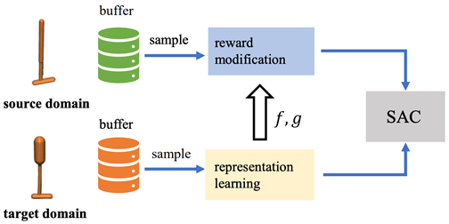 在强化学习中,学习能够转移到具有动力学差异的不同域中的有效策略至关重要。论文考虑了动力学适应设置,其中源域和目标域之间存在动力学不匹配,并且可以获得足够的源域数据,而只能与目标域进行有限的交互。现有方法通过学习域分类器、从价值差异角度进行数据过滤等方式来解决这一问题。相反,论文从解耦表示学习的角度来应对这一挑战,通过仅在目标域进行表示学习,并衡量源域转换过程中的表示偏差作为动力学不匹配的信号。表示偏差是给定策略在源域和目标域中的性能差异的上限,因此论文采用表示偏差作为奖励惩罚。产生的表示不参与策略或价值函数的任何部分,而仅作为奖励惩罚器。论文在具有运动学和形态学不匹配的环境中进行了广泛的实验,结果表明所提出的方法在许多任务上表现出非常好的性能。