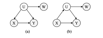 图:基于条件独立性测试的因果发现的示例。(a)和(b)分别代表U是潜在混杂因素和潜在中介变量的情况。因果发现的目标在于确定 X 是否为 Y 的因。