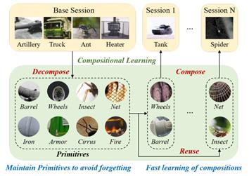 小样本增量学习旨在从基类学习大量数据后,持续学习仅有少量样本的新类别,对于机器而言仍是一个具有挑战的任务。与机器不同,人类可以轻松地仅用少量样本学习新类别。认知科学表明,人类这种能力的重要一环是人类的组成式识别能力,即从已知知识中提取视觉元素,随后用迁移的元素组成新类别,从而使增量学习更高效与可解释。为了模仿人类这种组成式学习能力,ICML2024论文《Compositional Few-Shot Class-Incremental Learning》提出了一种认知启发的小样本增量学习方法。该方法首先从集合相似度的角度定义并构建了组成式学习模型,随后为其配备了一个元素组合模块与一个元素复用模块。在元素组合模块中,该方法提出使用CKA相似度来拟合元素集的相似度计算,从而实现基于元素组合的训练与测试。在元素复用模块中,该方法通过其他类元素对当前类的重构来显式强化元素在类别间的复用。实验表明该方法取得了现有最优性能,并表现出更好的决策可解释性。