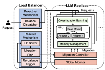 近年来,大型语言模型(LLM)的推断(inference)服务受到了广泛关注。然而,现有的推断系统在同时服务多个LoRA大模型时,存在同时服务多类请求资源利用率低以及负载不均的问题。为此,论文《dLoRA: Dynamically Orchestrating Requests and Adapters for LoRA LLM Serving》提出了一套多LoRA大模型的动态编排系统,旨在通过动态编排请求和LoRA适配器,提升LoRA大模型推断服务的效率。在实例层面,dLoRA根据请求分布动态在多类LoRA推断策略切换,实现计算效率和等待时长之间的更优权衡。在集群层面,dLoRA通过选择性预先加载LoRA adapter以及动态进行请求和LoRA adapter的协同迁移,实现集群层面负载均衡。实验结果表明,dLoRA相比单模型版本vLLM和HuggingFace PEFT提升吞吐至多50.7倍和30.5倍,相比同期工作S-LoRA,dLoRA可降低延迟至多1.8倍。该论文的第一作者为威廉体育williamhill2022级直博生吴秉阳(导师金鑫长聘副教授),作者包括威廉希尔体育朱睿冬、章梓立,上海人工智能实验室孙鹏,威廉希尔体育刘譞哲教授(通讯作者)和金鑫长聘副教授。