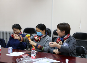 活动现场,宁波银行的工作人员将材料包里物品给女教职工做了详细介绍,有布料、支撑棍、棉绳、艾草包。在制作过程中,老师一边讲解,一边动手演示。女会员们也紧跟老师的步伐,将五彩斑斓的粗布平铺桌面,将艾草包置于布中央捏成紧实的圆形……在轻松愉快的氛围中,一个个形似话筒的养生锤便制作完成了。