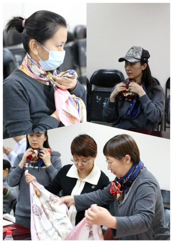 女会员们跟着毕老师的演示步骤,认真的学习对折、翻叠、打结、整理,大家根据自己的喜好将手中的丝巾变换出不同的系法,一边拍照留念,一遍向周边的同伴展示。活动现场气氛十分热烈,每个人脸上都洋溢着笑容且成就感满满。