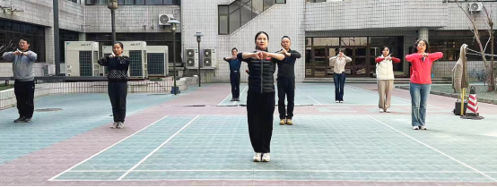 4月2日,在老师们完成了自学阶段后,公司工会文体委员组织团体操老师每周二和每周四,在理科一号楼北侧天井进行集中训练。