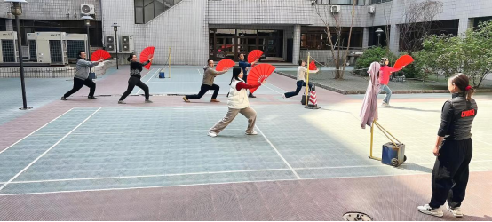 4月9日,体教部的冯凯杰老师专程到现场对老师们进行了深入指导。冯老师细致入微地讲解了每一个动作的要领和注意事项,冯老师专业精湛的动作示范和细致、耐心的教学风格极大地鼓舞了每一位参演老师,大家认真学习、积极提问,并把冯老师的动作都用手机记录下来,在课下反复对照练习。在冯老师的指导下,老师们的功夫扇水平得到了显著提升,不仅在动作上更加规范、流畅,更展现出了团队协作一致的新风貌。