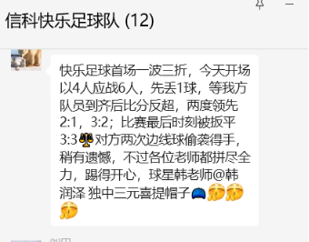在比赛结束后,老师们纷纷在群里发表感言,表示此次足球赛开心第一,比赛第二!这场球赛踢得非常过瘾!期待下一场比赛的到来!