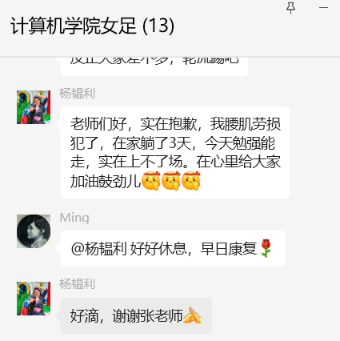 赛事当天,杨韫利老师由于腰肌劳损,未能现场参加,她时刻在群里关注着赛事进展,给老师们加油鼓劲!