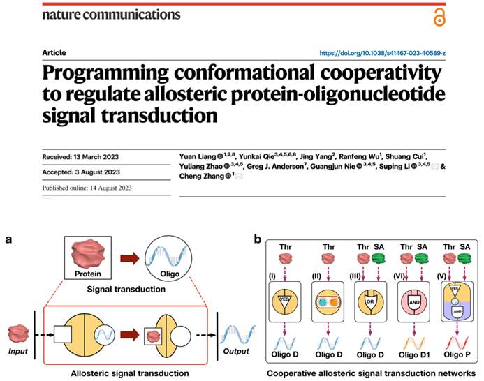 图1. (a) 蛋白质/DNA协同信号转导;(b)协同分子信号转导DNA电路逻辑计算。