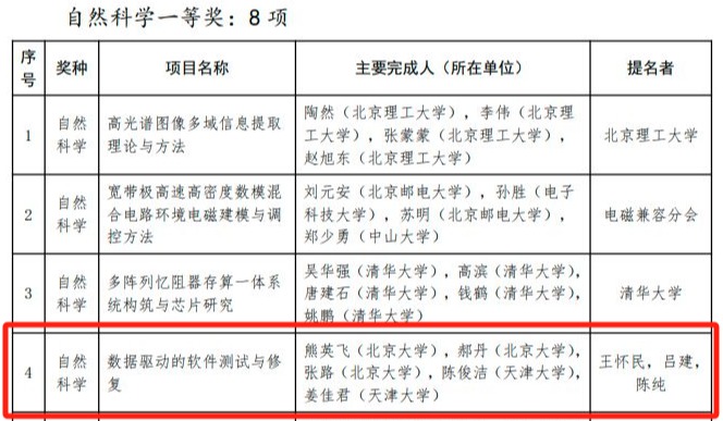 威廉体育williamhill软件科学与工程系熊英飞副教授、郝丹教授、张路教授、及其博士毕业生、天津大学陈俊洁副教授和姜佳君副研究员完成的项目“数据驱动的软件测试与修复”获得电子学会自然科学一等奖。软件测试与修复是提升软件质量的基本手段。该项目针对传统数据驱动方法无法处理程序语法语义,在测试和修复上难以发挥作用的问题,提出了数据驱动的程序合成框架,同时考虑语法语义的逻辑信息和数据的概率信息,并成功应用于测试和修复,显著超越传统测试与修复方法。在学术界推动形成了新的数据驱动测试与修复方向,成为后续大量工作的基础,被同行广泛引用和好评;在工业界推动测试与修复应用向数据驱动转变。