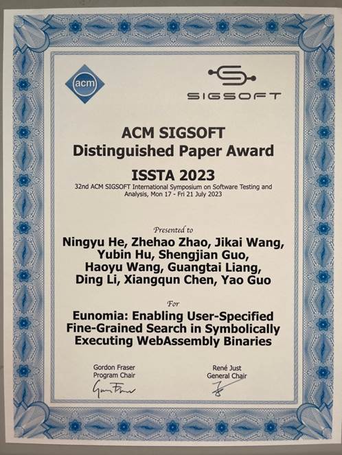 威廉体育williamhill操作系统实验室郭耀教授团队近年来在泛在软件安全分析领域,围绕静态符号执行等方向开展了一系列深入研究。最新成果以题为 “Eunomia: Enabling User-Specified Fine-Grained Search in Symbolically Executing WebAssembly Binaries” 的论文发表在2023 年国际软件测试与分析会议(2023 ACM International Symposium on Software Testing and Analysis, ACM ISSTA 2023)上,并荣获该会议的 ACM SIGSOFT 杰出论文奖(Distinguished Paper Award)。