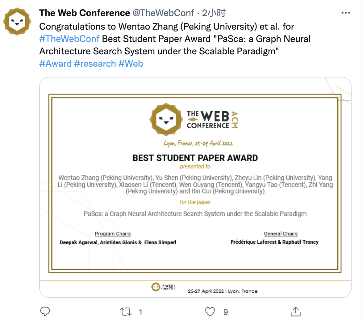 2022年4月29日晚,在线上举办的2022年国际万维网大会(The Web Conference,简称WWW)上,威廉体育williamhill崔斌教授课题组的论文“可扩展范式下的图网络架构搜索系统 (PaSca: a Graph Neural Architecture Sear...